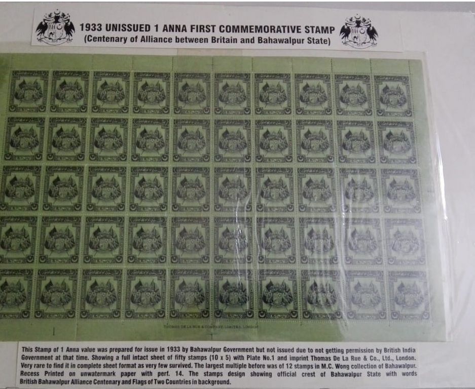 BAHAWALPUR 1933 UNISSUED 1 ANNA FULL SHEET OF 5 X 10 = 50 STAMPS OF FIRST COMMERMATIVE ISSUE (CENTENARY OF ALLIANCE BETWEEN BRITIAN AND BAHAWALPUR STATE WITH PLATE NO 1 AND IMPRINT OF THOMAS DE LA RUE
