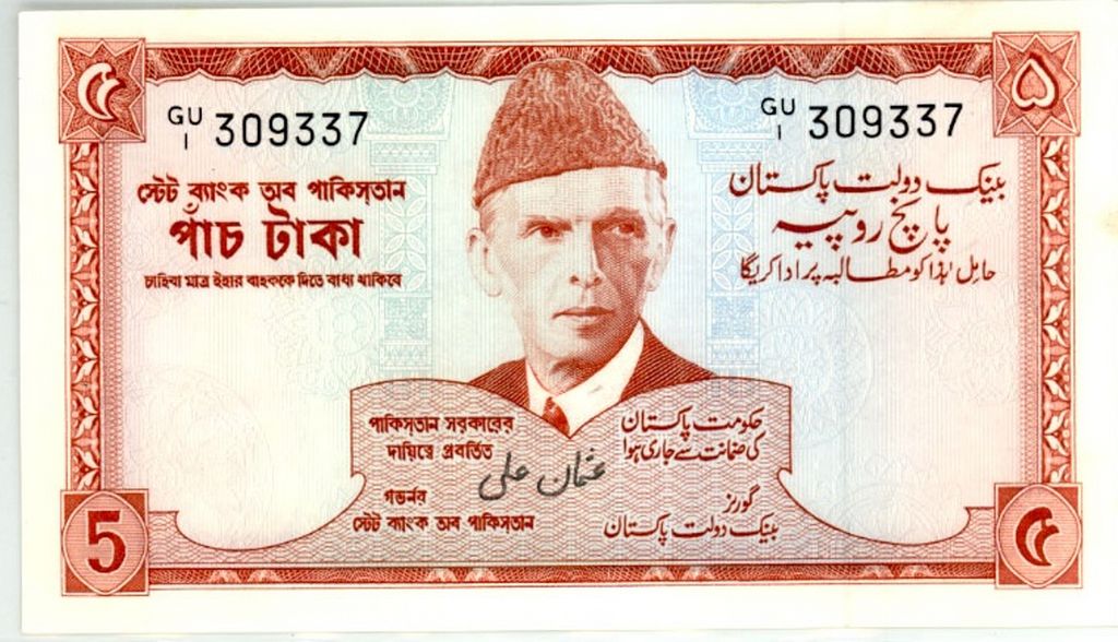 Category Banknotes Lot number 636 Starting Bid 500 Lot Pictures Pakistan 5 Rupee Banknote Signature by Usman Ali prefix GU/1. P-25e Condition UNC with Pinhole