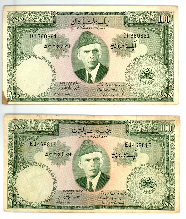 Category Banknotes Lot number 653 Starting Bid 1000 Lot Pictures Pakistan Lot of 2 x 100 Rupees Banknote (Badshahi Mosque Green) Signature by Mebub ur Rashid P.22i – prefix: DH, EJ