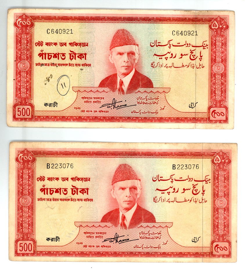 Category Banknotes Lot number 658 Starting Bid 1000 Lot Pictures Pakistan Lot of 2 x 500 Rupees Banknote (State Bank Red ) Signature by Shujaat Ali Hasni Karachi P.23 – prefix: B, C