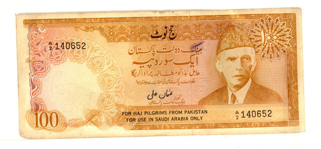 Category Banknotes Lot number 675 Starting Bid 30000 Lot Pictures Pakistan 100 Rupee HAJ NOTE Signature by Usman Ali Prefix A/2 condtion XF+