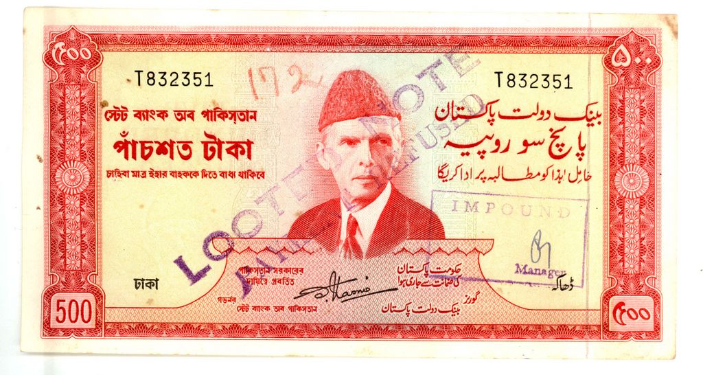 Category Banknotes Lot number 676 Starting Bid 2000 Lot Pictures Pakistan RS 500 LOOTTED NOTE signature by Shujat Ali Hasni (DACCA) prefix T Condtion XF