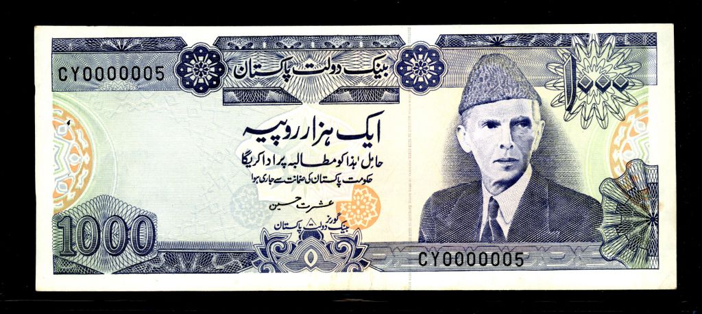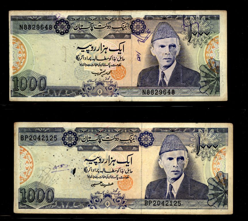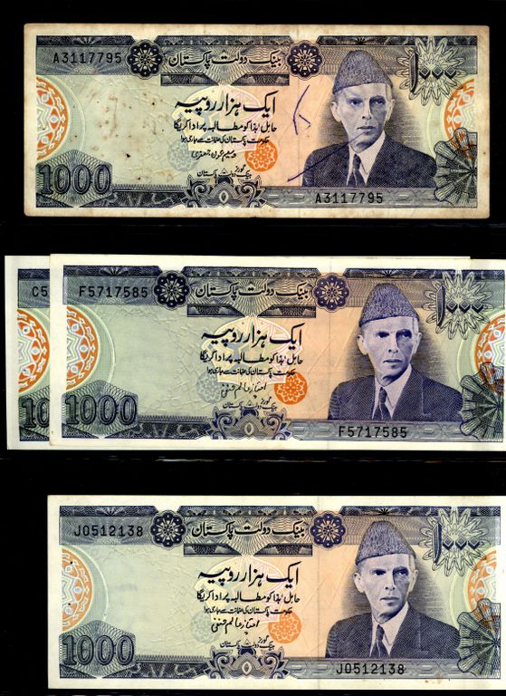 Pakistan Lot of 7 x 1000 Rupee Banknote Signature by Wasim Aun Jafery, Imtiaz Alam Hanfi, Muhammad Yakoob, Ishrat Hussain with Different Prefix Study, Condition UNC - XF