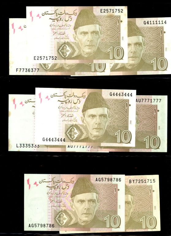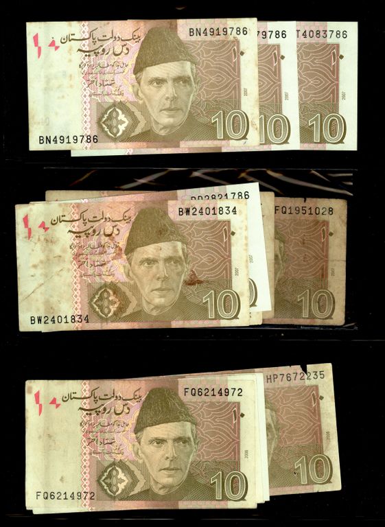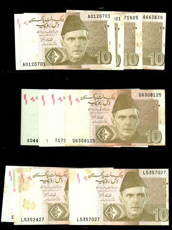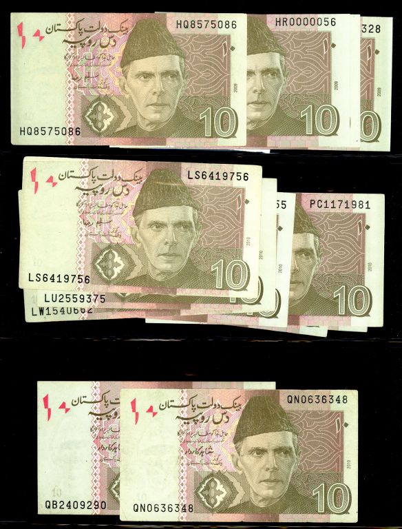 Pakistan Lot of 56 x 10 Rupee Banknote Signature by Shamshad Akhtar, Saleem Raza, Shahid Kardar with Different Prefix Study, Condition UNC - XF