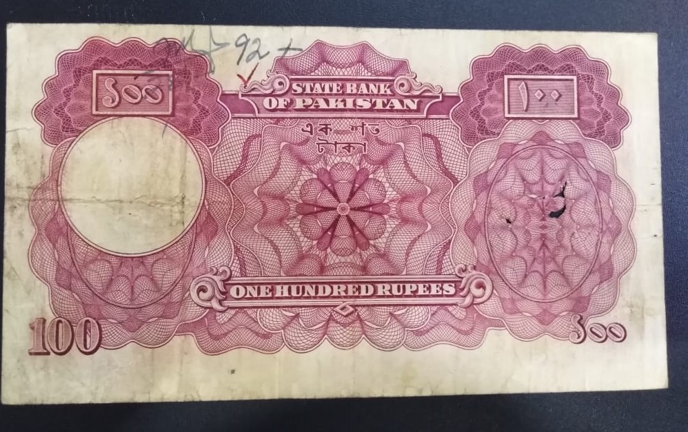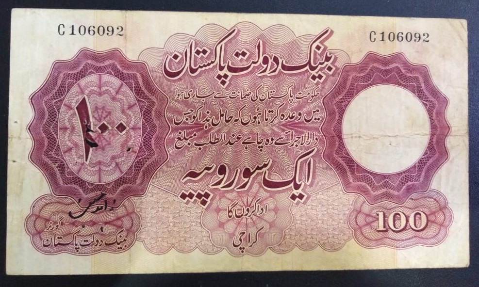 Category Banknotes Lot number 731 Starting Bid 3000 Lot Pictures Pakistan Rs 100 Signature by Zahid Hussain Karachi prefix "C" Condition F+
