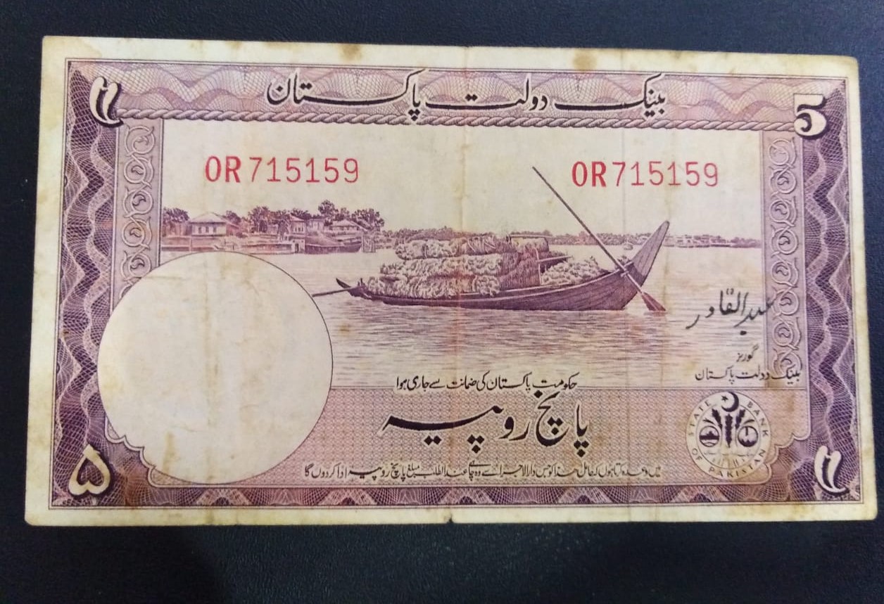 Category Banknotes Lot number 743 Starting Bid 3000 Lot Pictures Pakistan Rs5 Signature by Abdul Qadir prefix OR Condition fine