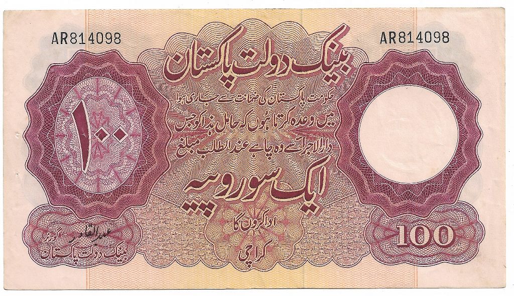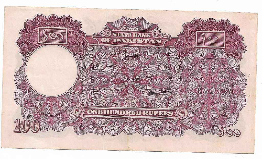 Category Banknotes Lot number 752 Starting Bid 1000 Lot Pictures Pakistan Rs 100 Signature by Abdul Qadir (Karachi) prefix AR Condition AUNC with pin hole