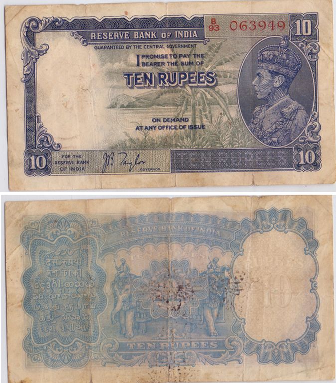 Category Rest of World Banknote Lot number 806 Starting Bid 4000 Lot Pictures British India 1937 KGVI 10-Rupees P-19a sign J.B Taylor F-VF.