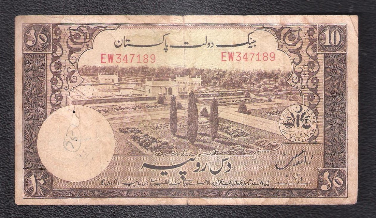 Category Banknotes Lot number 608 Starting Bid 500 Lot Pictures Pakistan RS 10 Signature by Zahid Hussain prefix EW Condition fineĀ