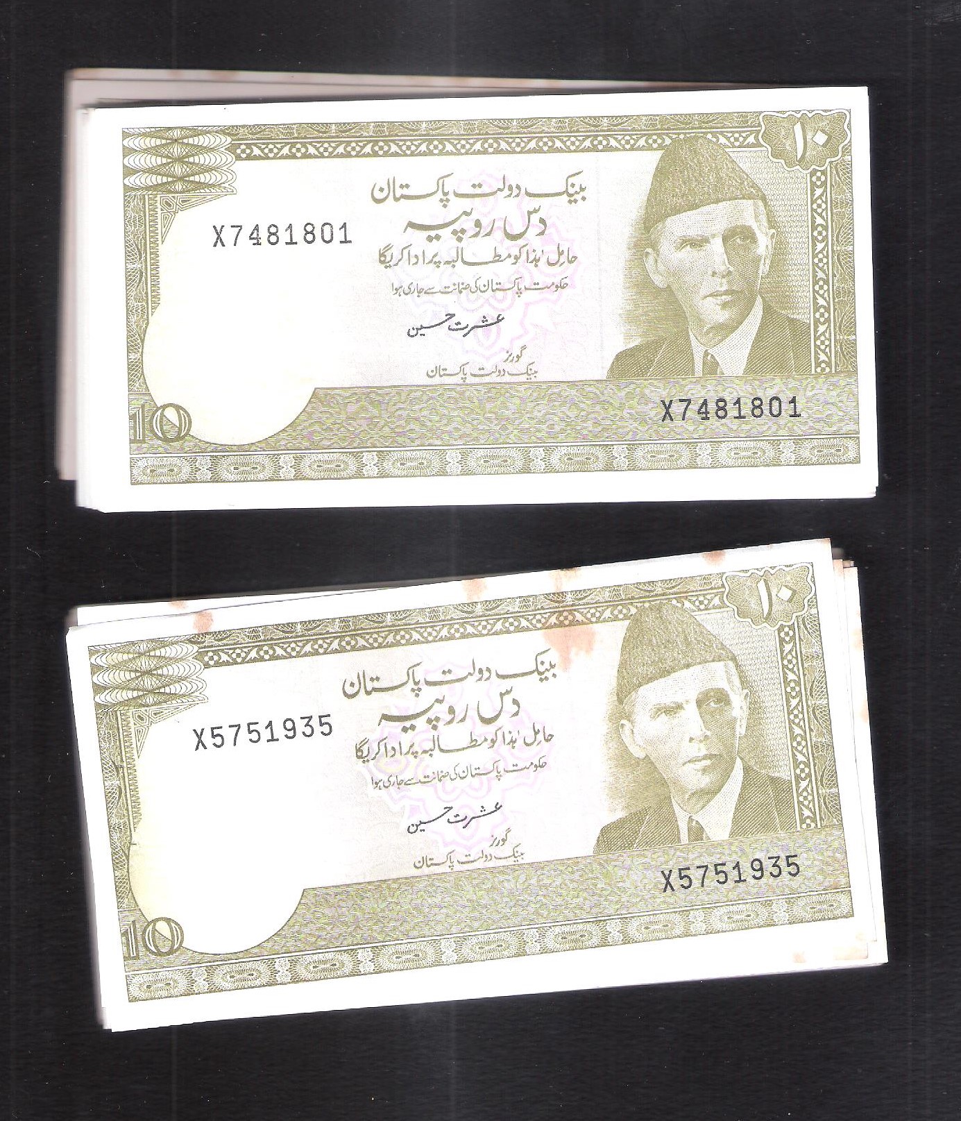 Category Banknotes Lot number 645 Starting Bid 3500 Lot Pictures Pakistan Rs. !0 (118 notes) Signature by Ishrat Hussain prefix X (Replacement) condition UNC with stain Add to Slideshow Off