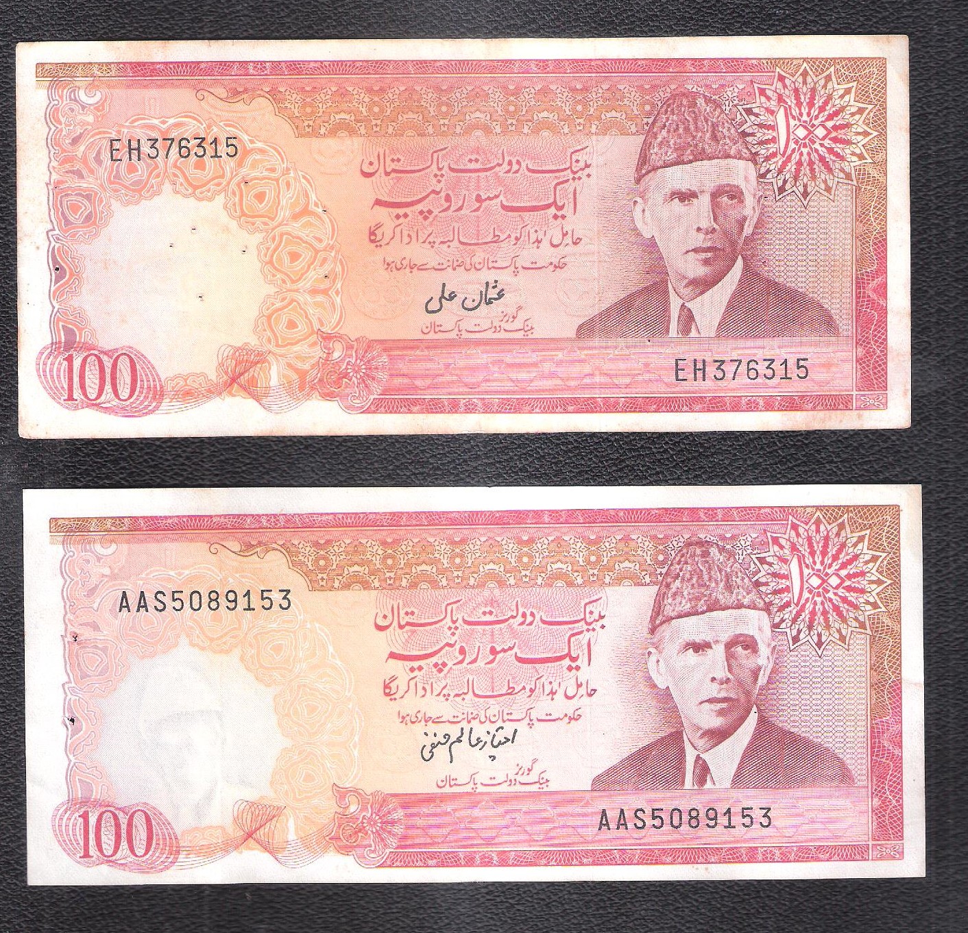 Category Banknotes Lot number 650 Starting Bid 300 Lot Pictures Pakistan Rs. !00 (2 notes) Signature by Imtiaz Alam Hanif and Osman Ali condition XF Add to Slideshow Off