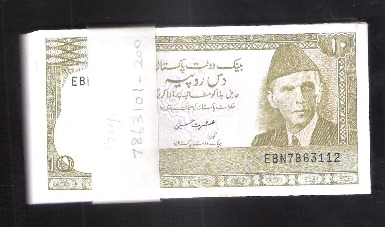 Category Banknotes Lot number 667 Starting Bid 1400 Lot Pictures Pakistan Rs. !0 (98 notes) Signature by Ishrat Hussain prefix EBN condition UNC Few top with stain Add to Slideshow Off