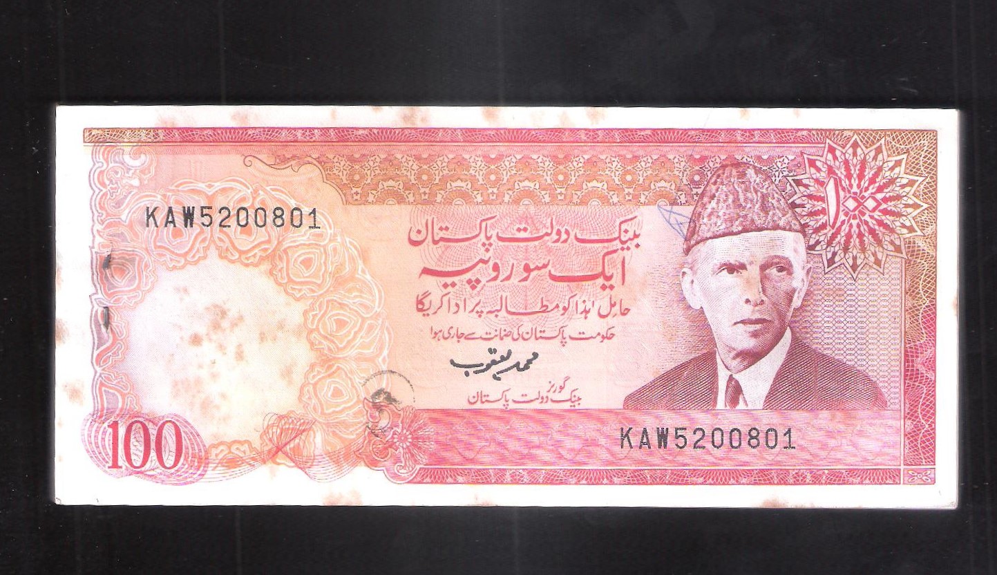 Category Banknotes Lot number 674 Starting Bid 10000 Lot Pictures Pakistan Rs. !00 (100 notes) Signature by Muhammad Yakoob prefix KAW condition UNC with stain Add to Slideshow Off