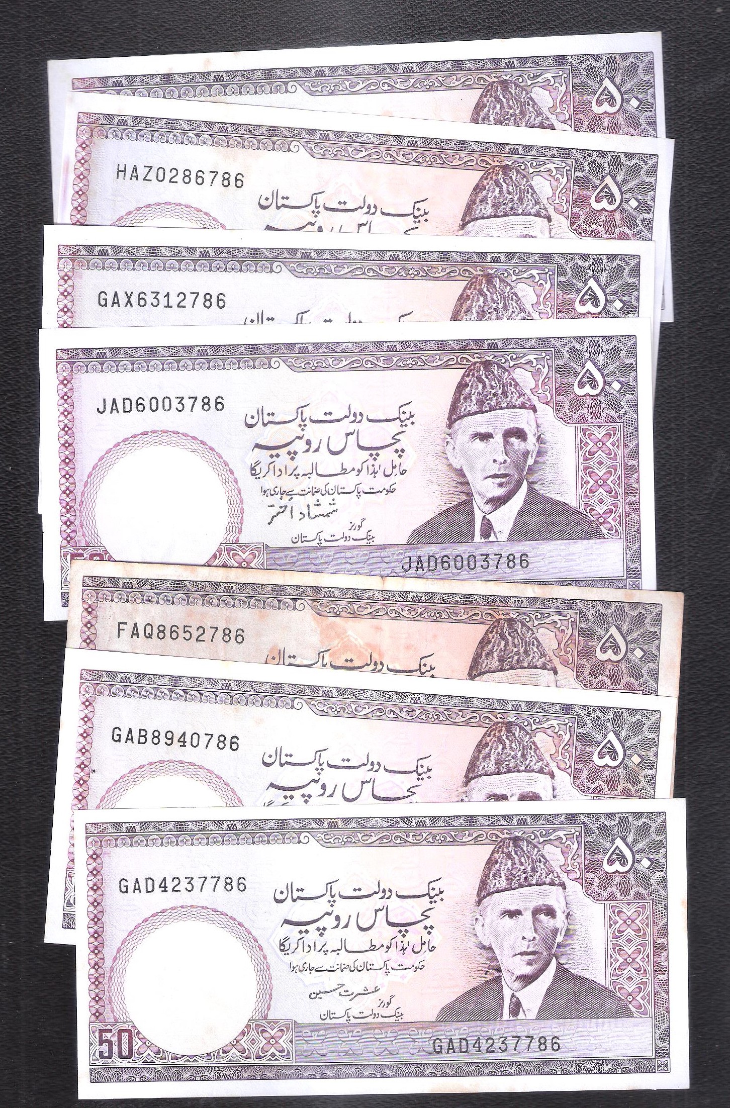 Category Banknotes Lot number 691 Starting Bid 500 Lot Pictures Pakistan Rs. 50 (7 notes) Signature by Ishrat Hussain , Shamshad Akhtar with 786 condition AUNC-XF Add to Slideshow Off