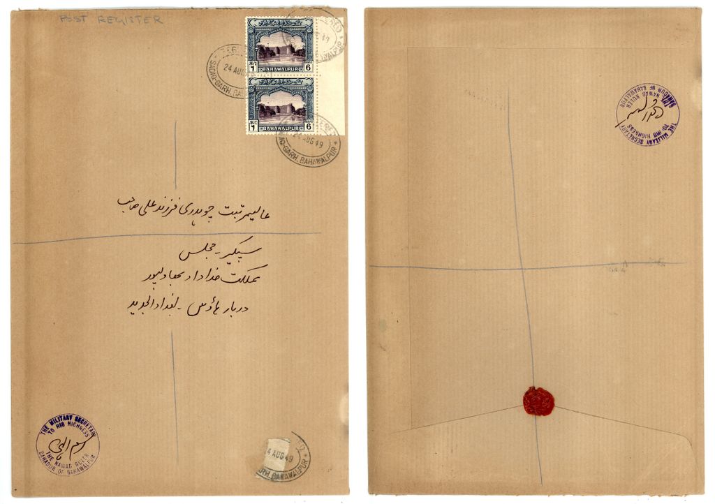 Bahawalpur Large Registered Cover franked with vertical pair of 6 anna definitive (SG 26) stamp cancelled by Elliptical of REGISTERED/BAHAWALPUR dated 24 Aug 1949 with PFP Certificate