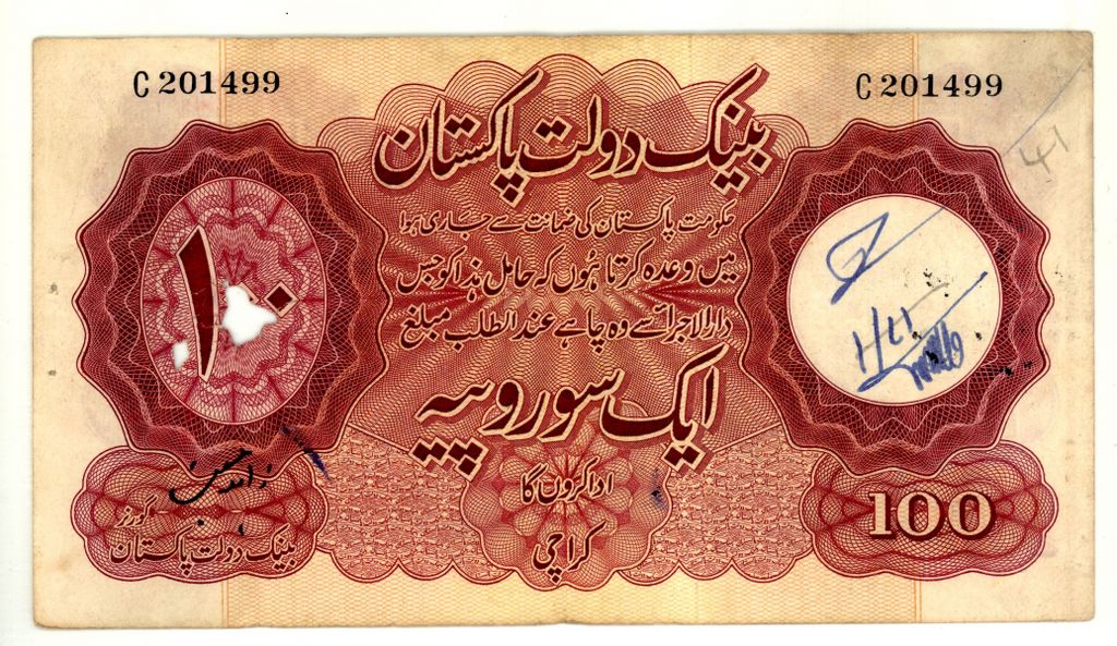 Category Banknotes Lot number 603 Starting Bid 5000 Lot Pictures Pakistan Rs 100 Signature by Zahid Hussain (Karachi) prefix C Condition Fine with spindle hole