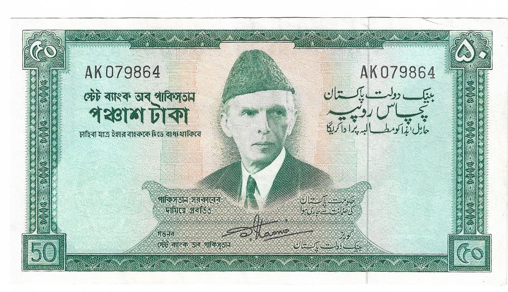 Category Banknotes Lot number 618 Starting Bid 4000 Lot Pictures Pakistan Rs 50 Signature by Shujat Ali Hasni (Green) Condition XF+