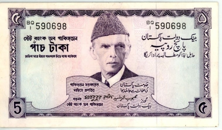 Category Banknotes Lot number 632 Starting Bid 1000 Lot Pictures Pakistan 5 Rupee Banknote Signature by Mehbub-ur–Raschid prefix BQ/1.P-19d Condition UNC with Pinhole