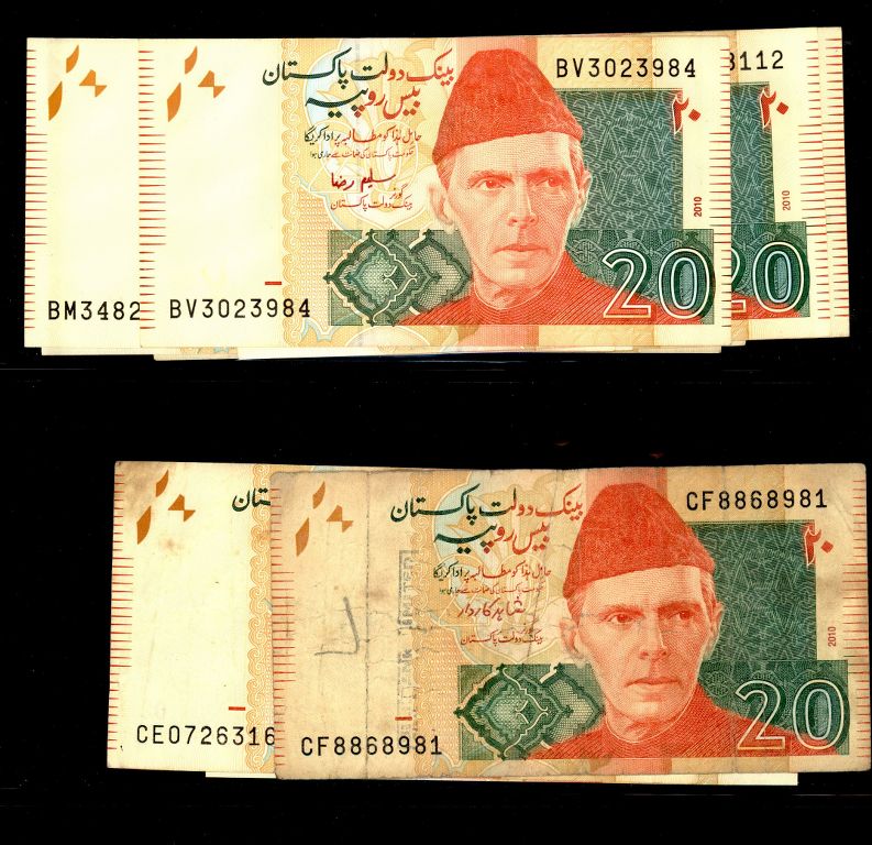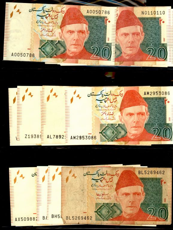 Pakistan Lot of 32 x 20 Rupee Banknote Signature by Shamshad Akhtar, Saleem Raza, Shahid Kardar with Different Prefix Study, Condition UNC - XF