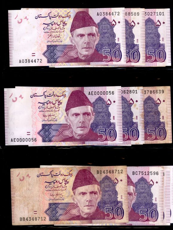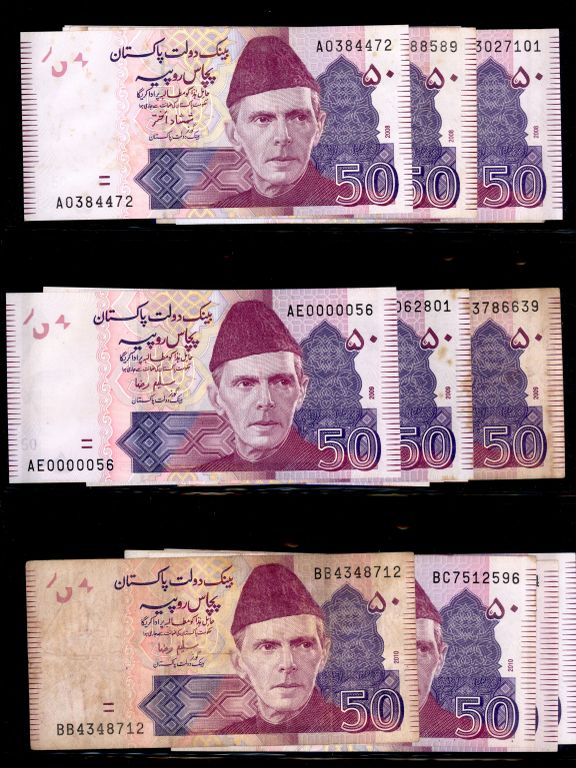 Pakistan Lot of 22 x 50 Rupee Banknote Signature by Shamshad Akhtar, Saleem Raza, Shahid Kardar with Different Prefix Study, Condition UNC - XF