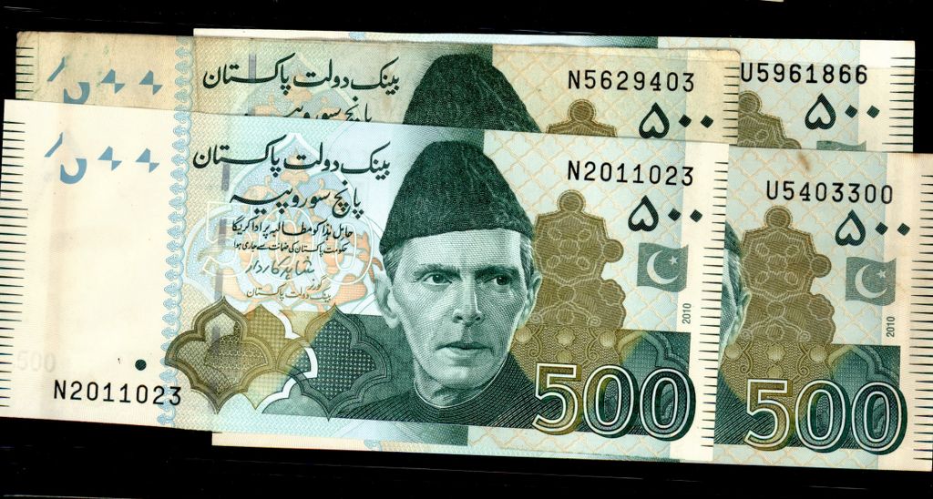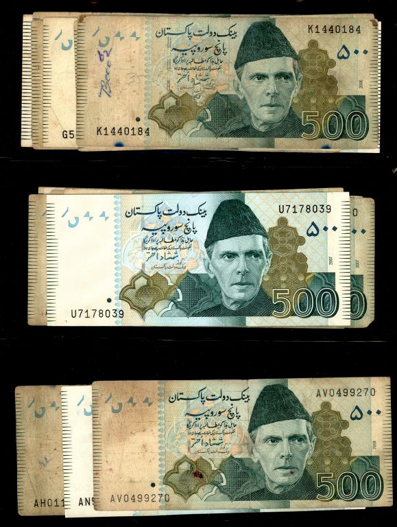 Pakistan Lot of 69 x 500 Rupee Banknote Signature by Shamshad Akhtar, Saleem Raza, Shahid Kardar with Different Prefix Study, Condition UNC - XF