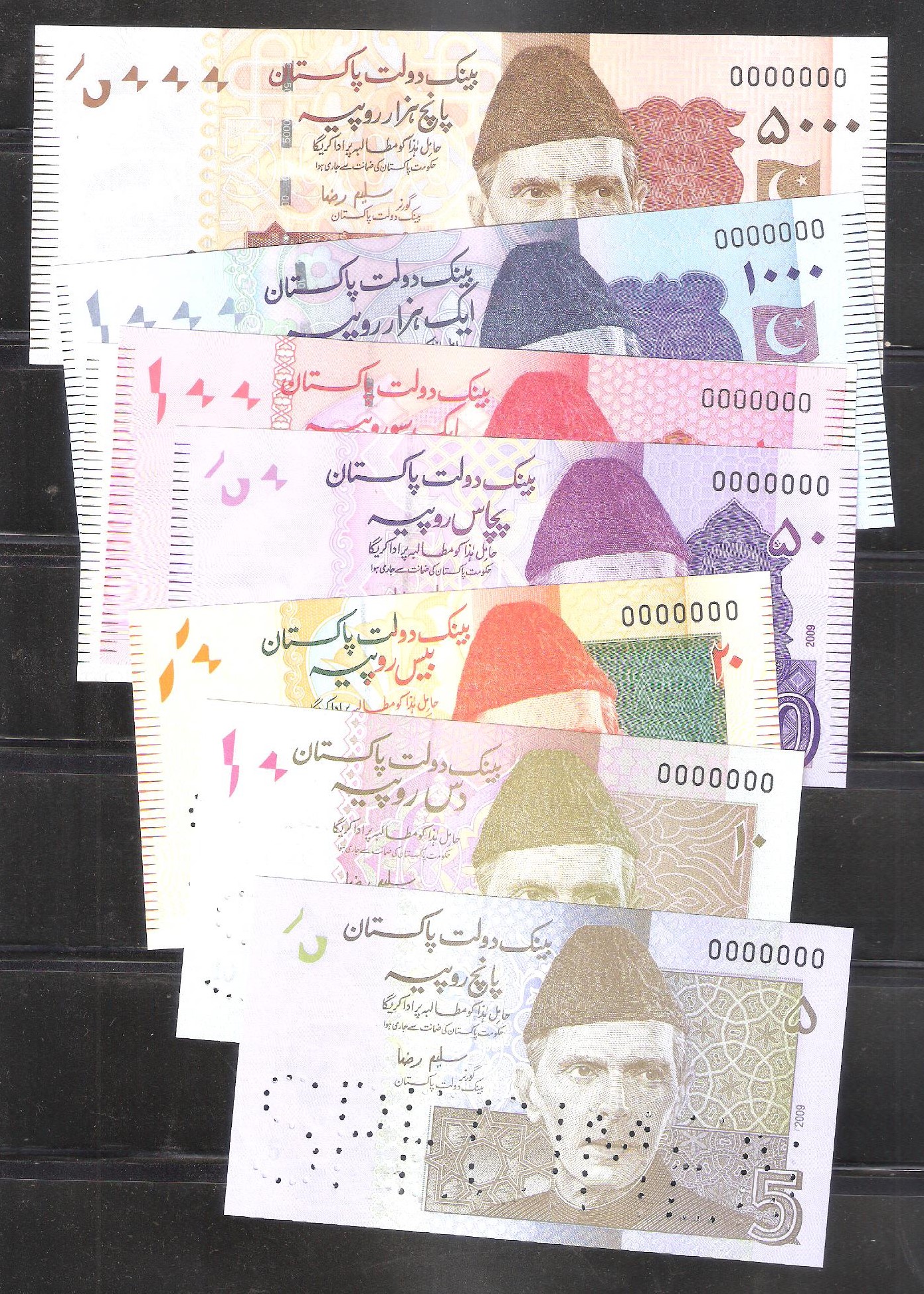 Category Banknotes Lot number 691 Starting Bid 65000 Lot Pictures Pakistan Complete Set of 8 SPECIMEN Signature by Saleem Raza UNC with Official Folder