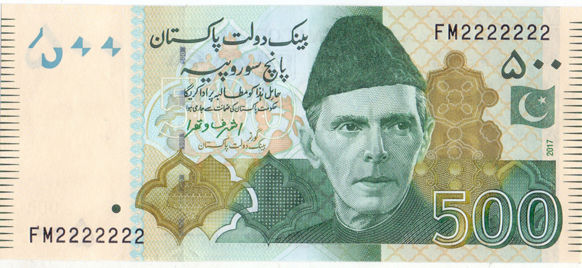Category Banknotes Lot number 717 Starting Bid 2000 Lot Pictures Pakistan Banknote 2017 Rs.500 sign.Ashraf Wathra Fancy No.FM2222222 UNC.
