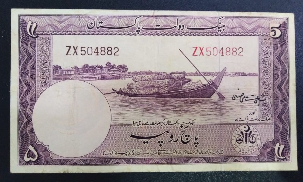 Category Banknotes Lot number 723 Starting Bid 5000 Lot Pictures Pakistan Rs 5 Jute Boat with large prefix "ZX" CONDITION XF