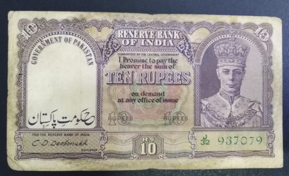 Pakistan Rs 10 Signature by C.D. Deshmukh British India with over print “Government of Pakistan Condition good as per image