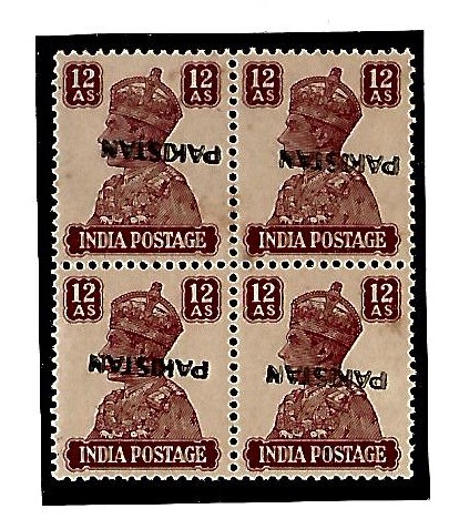 Category Pakistan Overprint Lot number 201 Starting Bid 4000 Lot Pictures Pakistan 1948 KG VI 12 a. Karachi overprint block of four inverted, SG Cat. GBP 60-