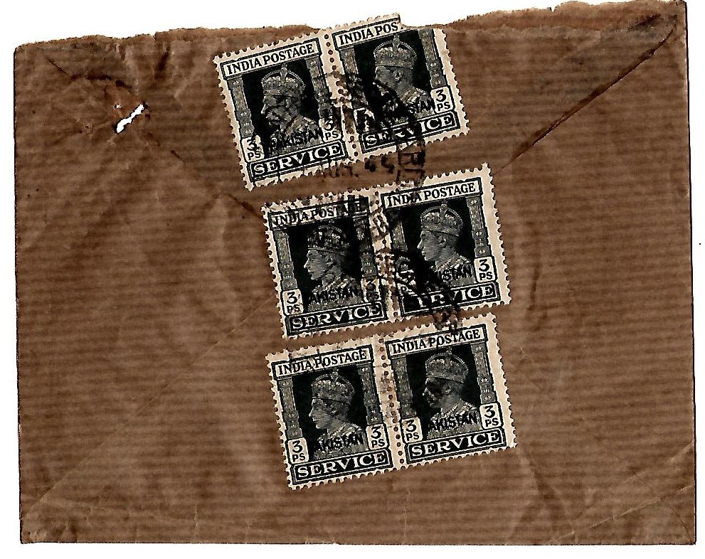 Pakistan – 1949 On Pakistan State Service brown envelope with multiple KG VI 3p. Nasik overprinted 'service' value. CDS Pakistan Secretariat, Karachi 4th August 1949. Addressed to S.M. Murtaza & Sons,
