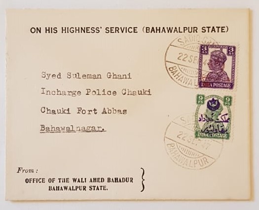 Bahawalpur ON HIS HIGHNESS SERVICE BAHAWALPUR Cover bearing 3 a & 9p Overprint Crescent and Star cancelled SADIQ-GARH/BAHAWALPUR dated 22 Sep 1947 with PFP Certificate