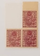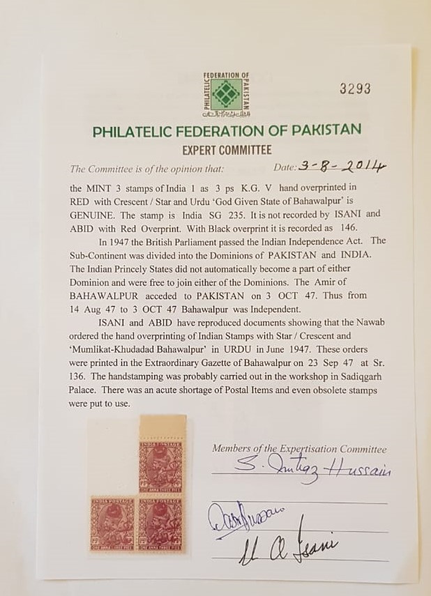 Bahawalpur 3 Mint stamp 1a3ps of KG V with Hand Overprint in RED Crescent and Star and God given State of BahawalpurÂ