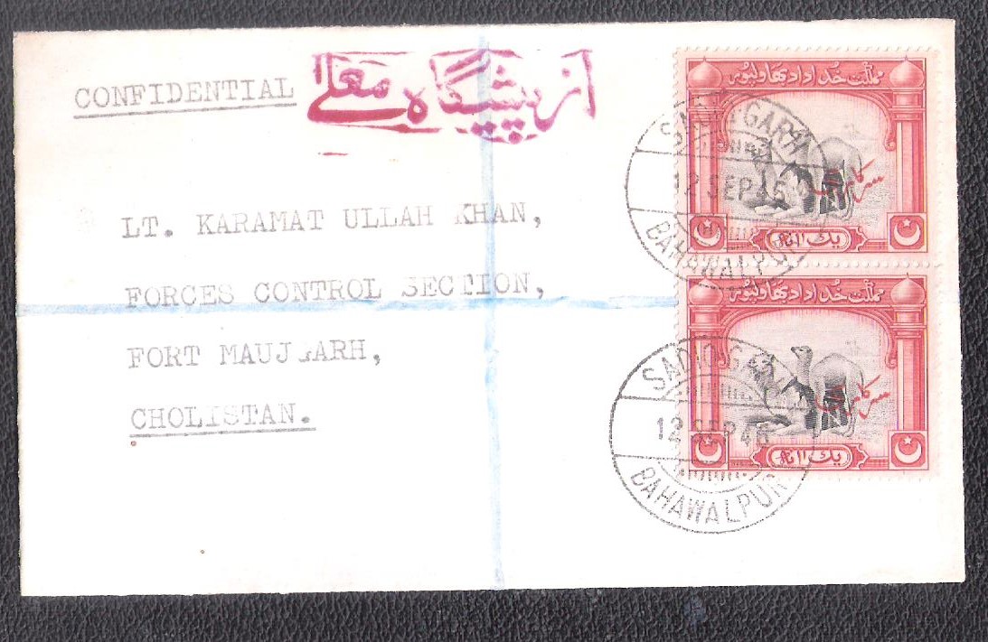 Category Bahawalpur Lot number 509 Starting Bid 18000 Lot Pictures Bahawalpur Cover franked with 2 x 1 anna Camle and clif from SADIQ-GARH dated 12 Sep. 1948