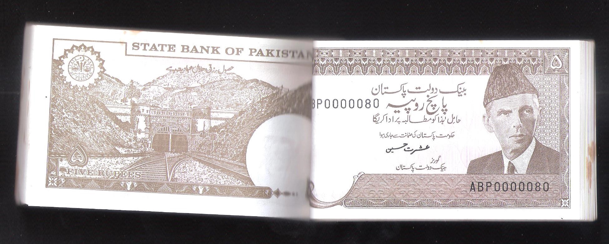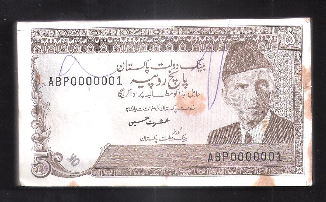 Category Banknotes Lot number 637 Starting Bid 1500 Lot Pictures Pakistan Rs. 5 (100 notes) Signature by Ishrat Hussain prefix ABP 0000001-00000100 condition UNC with Stain Add to Slideshow Off