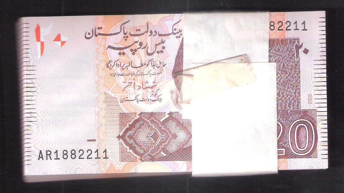 Category Banknotes Lot number 638 Starting Bid 2000 Lot Pictures Pakistan Rs 20 (88 Notes) Signature by Shamshad Akhtar 2006 Issue AR prefix UNC Add to Slideshow Off