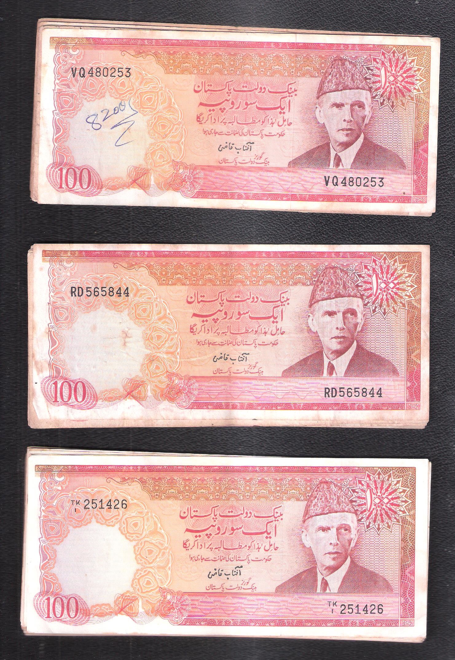 Category Banknotes Lot number 653 Starting Bid 2000 Lot Pictures Pakistan Rs. !00 (35 notes) Signature by Aftab Qazi condition XF-F Add to Slideshow Off