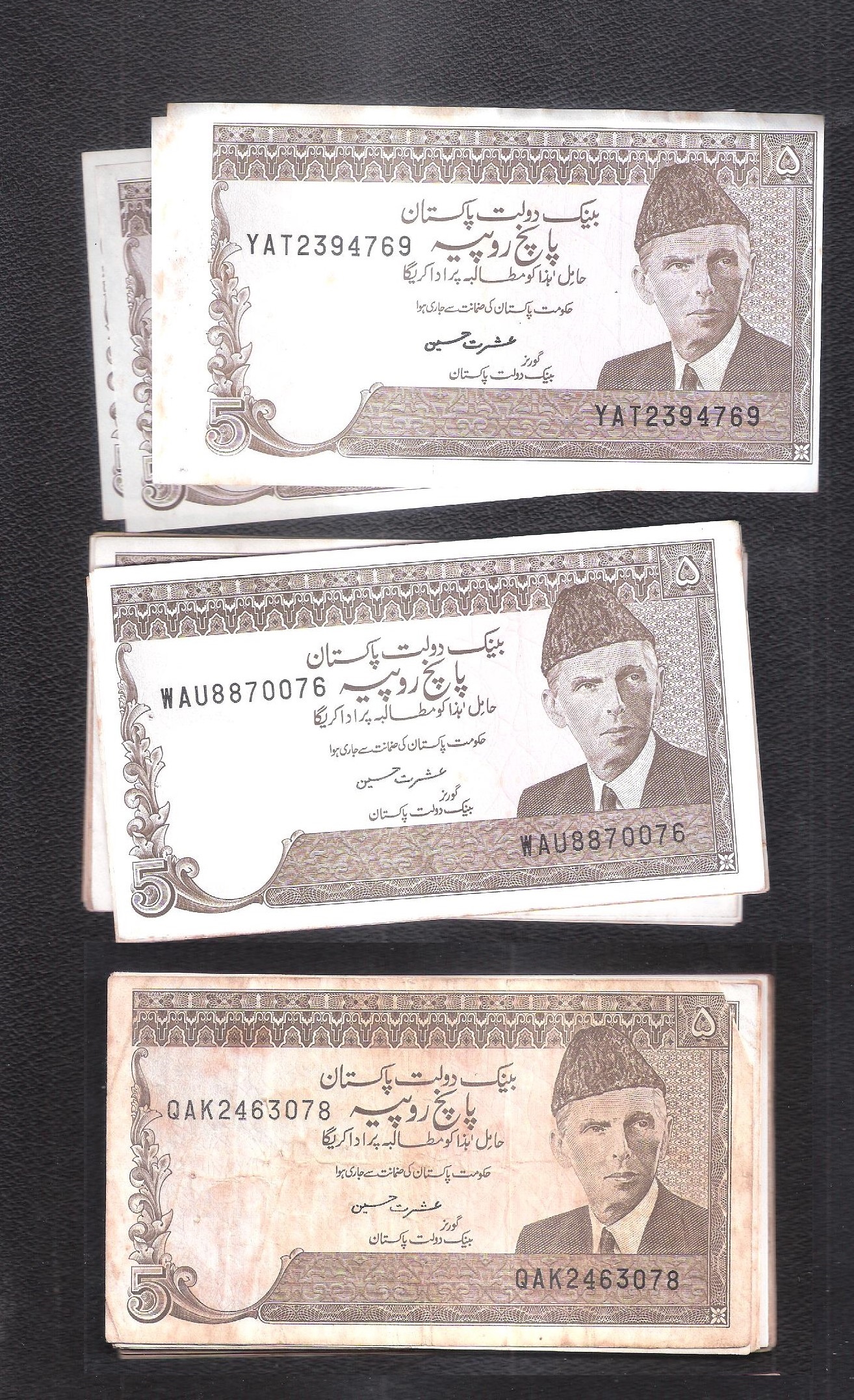 Category Banknotes Lot number 658 Starting Bid 300 Lot Pictures Pakistan Rs. 5 (50 notes) Signature by Ishrat Hussain condition UNC – XF Add to Slideshow Off