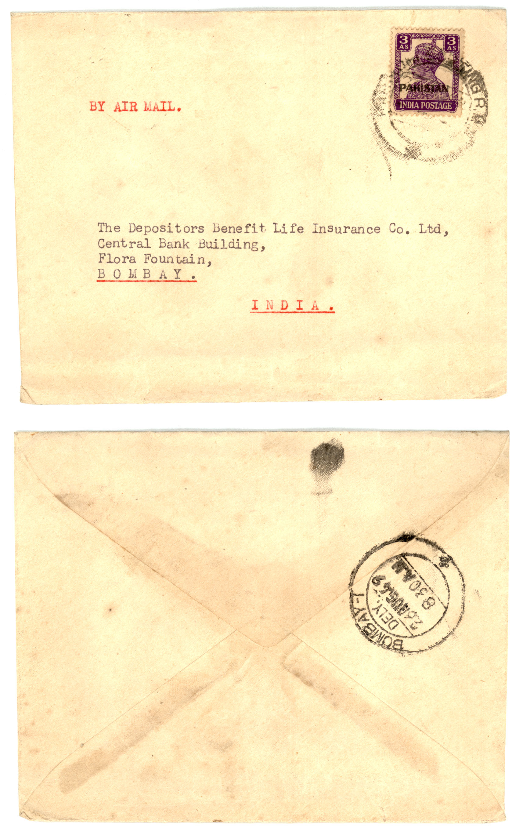Cover bearing British India KG VI 3a with Overprint “PAKISTAN” from Karachi to Bombay India cancelled by KARACHI SORTING R.M.S 1949